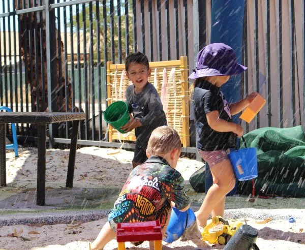 Children and educators building sandcastles in the sand pit